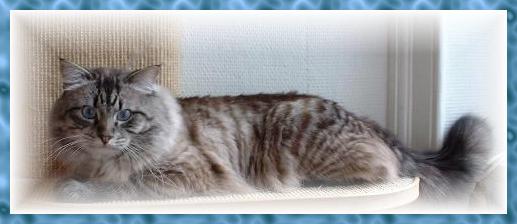 Da wir 2 wundervolle Neva Masquarade Damen als Mitbewohner hatten, lag der Gedanke nahe, nach einem eigenen Deckkater Ausschau zu halten. Nach langem Suchen und Warten erreichte uns damals ein Fax, daß in einem 8er-Wurf Nevas 4 Kater seien. Wir ließen uns sofort einen Kater reservieren; natürlich den besten, liebsten, schönsten und, und, und.... ääh, diese Babys waren noch keine 24 Stunden alt. Da uns aber die Elterntiere bekannt waren, hatten wir eine gewisse Ahnung, daß es dort einige typvolle Tiere geben müßte. Als wir Borjenka dann mit 6 Wochen das erste Mal sahen, war es beiderseits Liebe auf den ersten Blick! Er wich uns die ganze Zeit nicht von der Seite und er war all das, was wir uns von ihm wünschten. Als unser lieber "Dudel", sein von uns gegebener Kosename, bei uns einzog, hatten wir das Gefühl, daß dieses Katerchen wohl noch nie woanders gelebt hat. So unkompliziert gestaltete sich sein Willkommen bei seinen beiden "Haremsdamen". Seinem Charme und seiner ständigen Verschmustheit sind schon viele Menschen zum Opfer gefallen. Seine Fangemeinde wird stets größer. Er kleidet sich in der Fellfarbe seal-tabby-point. Dudel liebt übrigens den Geruch von Heilpflanzenöl und Eukalyptusöl. Ab und zu freut er sich auch über einen kleinen Schluck Pfefferminztee.